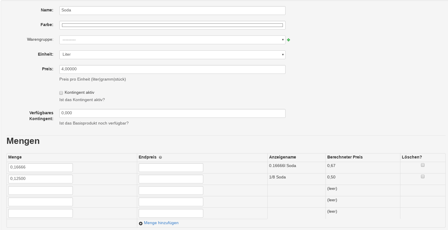 Mengen: Um im Weiteren das Produkt Weißer Spritzer zusammenstellen zu koennen, wird hier die Menge 0,125 (1/8 Liter) angelegt. Diese Menge ist dann im Produkt als Bestandteil wählbar.