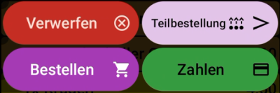 Mit dem roten Verwerfen Button verlässt man die Bestell-Ansicht ohne die Bestellung zu versenden. Die drei anderen Buttons senden die Bestellung und diese wird als Bestell-Bon am zugewiesenen Drucker ausgedruckt.