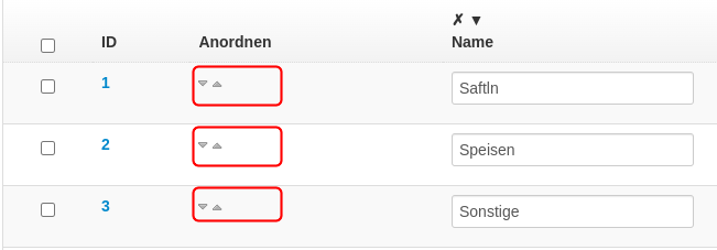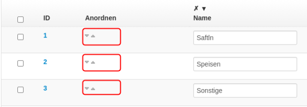 Die Reihenfolge der Produktgruppen wird mit den kleinen Pfeiltasten in der Listenansicht der Produktgruppen verwaltet.