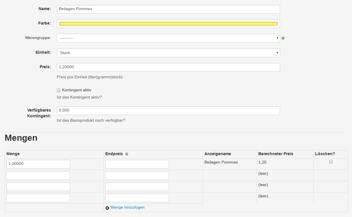 - Mengen: Um im Weiteren das Produkt Schnitzel mit Pommes zusammenstellen zu können, wird hier die Menge 1 angelegt. Diese Menge ist dann im Produkt als Bestandteil auswählbar.