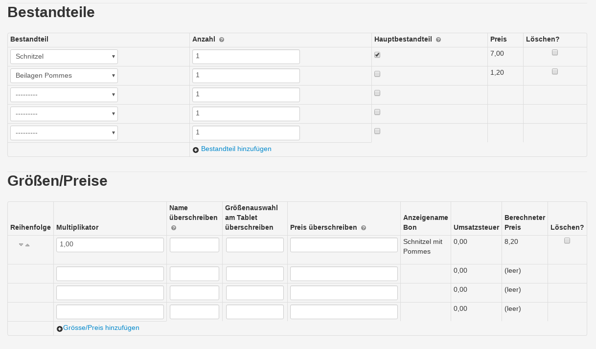 - Bestandteile - Bestandteil: Hier werden die Bestandteile … genauer die Mengen aus den zuvor angelegten Basisprodukten ausgewählt und somit das Produkt zusammengestellt. In diesem Beispiel sind das „Schnitzel“ und „Beilagen Pommes“.